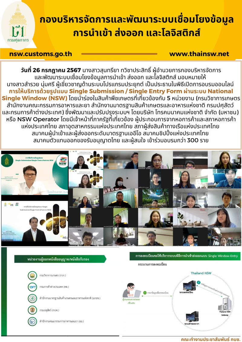 พิธีเปิดการอบรมออนไลน์ การให้บริการด้วยรูปแบบ Single Submission / Single Entry Form ผ่านระบบ National Single Window (NSW) โดยนำร่องในสินค้าพืชเกษตรที่เกี่ยวข้องกับ 5 หน่วยงาน